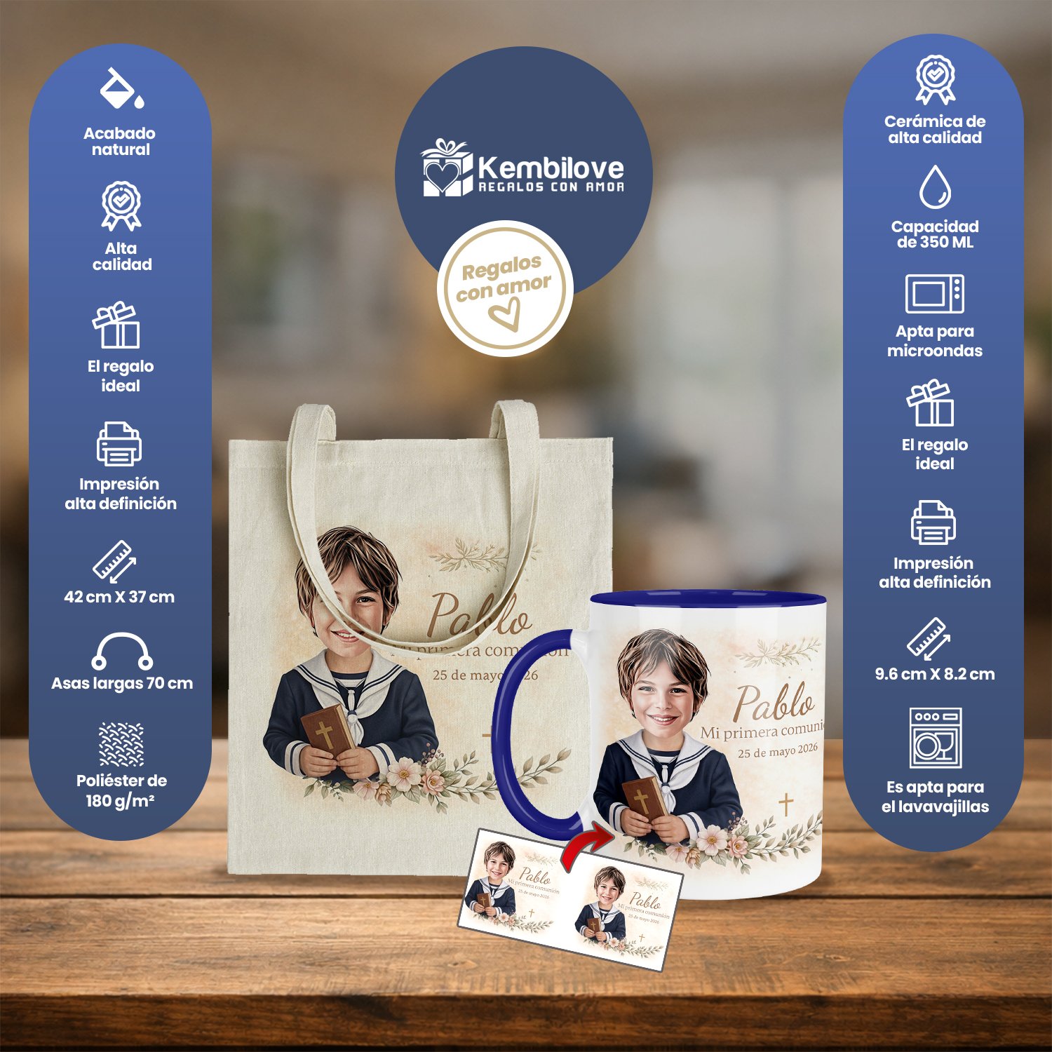 En Kembilove hemos diseñado la solución con este regalo comunión niño original. Este set de taza y bolsa de tela no es una personalización cualquiera. Además de su nombre y la fecha de la ceremonia, incluimos una carismática caricatura de un niño marinero. Es un diseño divertido, moderno y lleno de personalidad que conecta directamente con los más pequeños.