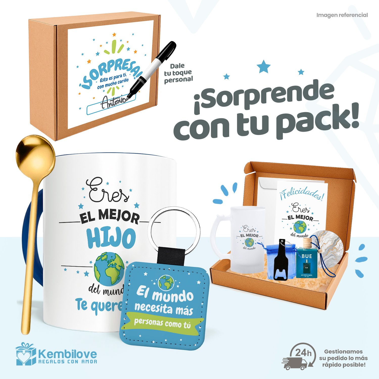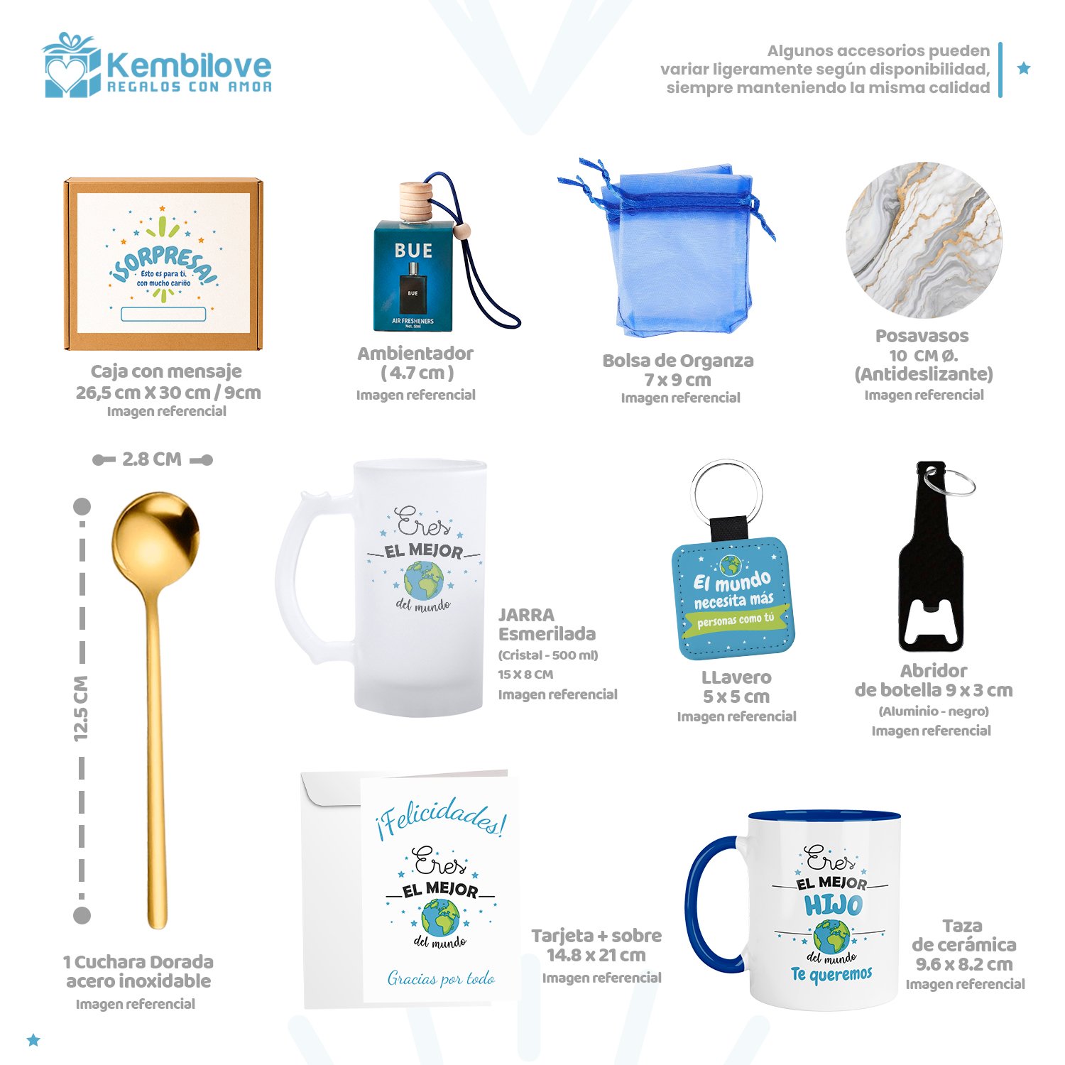 Este regalo para hijo destaca por su funcionalidad. Por un lado, la taza y la jarra son perfectas para sus bebidas favoritas. Por otro lado, accesorios como el abridor, el llavero o el ambientador hacen que el pack sea aún más completo.