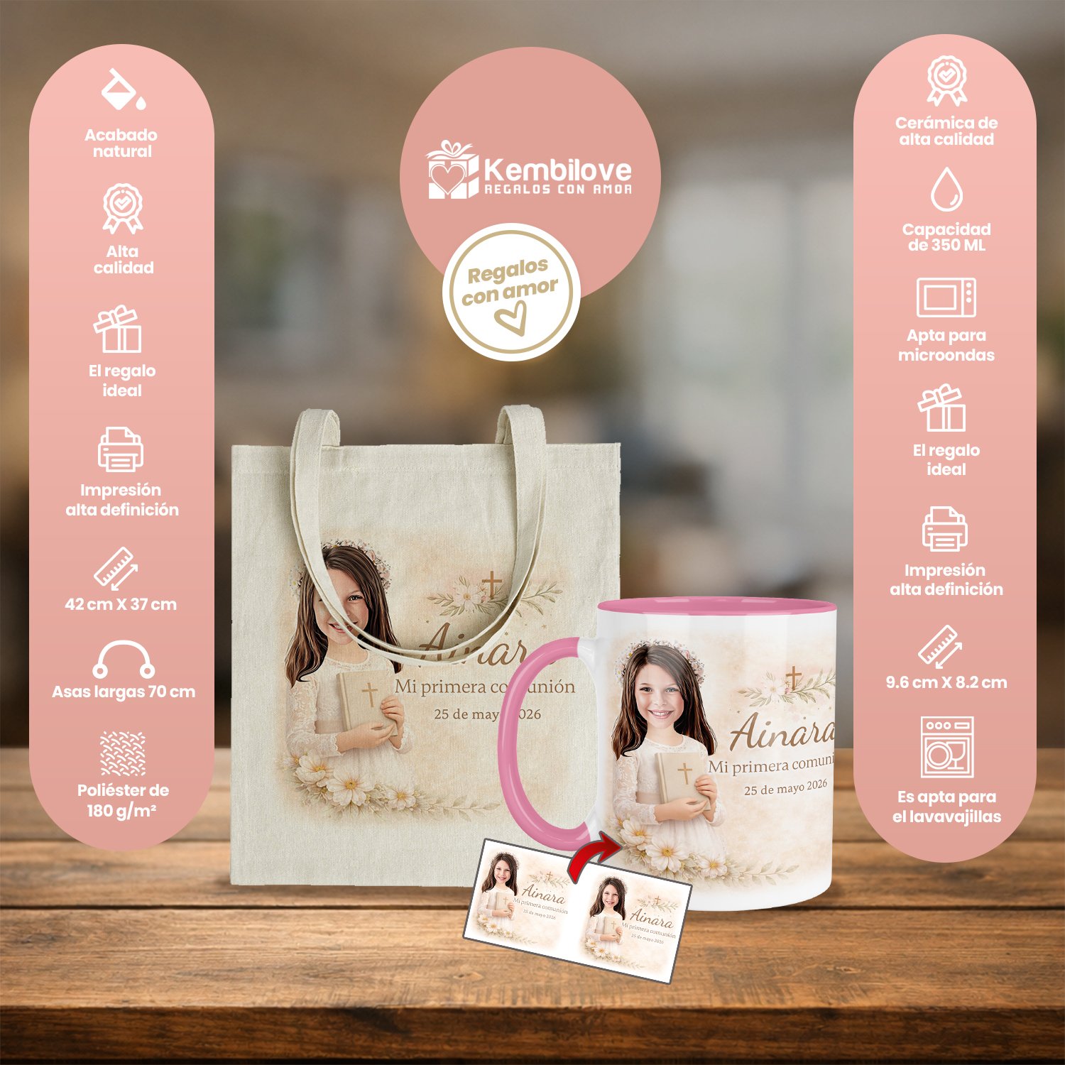 En Kembilove tenemos la solución perfecta con nuestro regalo original comunión niña. Este set de taza y bolsa de tela va un paso más allá de la personalización tradicional. No solo incluimos su nombre y la fecha de la ceremonia, sino que añadimos una encantadora caricatura que representa la ilusión de ese día. Es un diseño vibrante, alegre y lleno de vida que captura la esencia de su infancia.